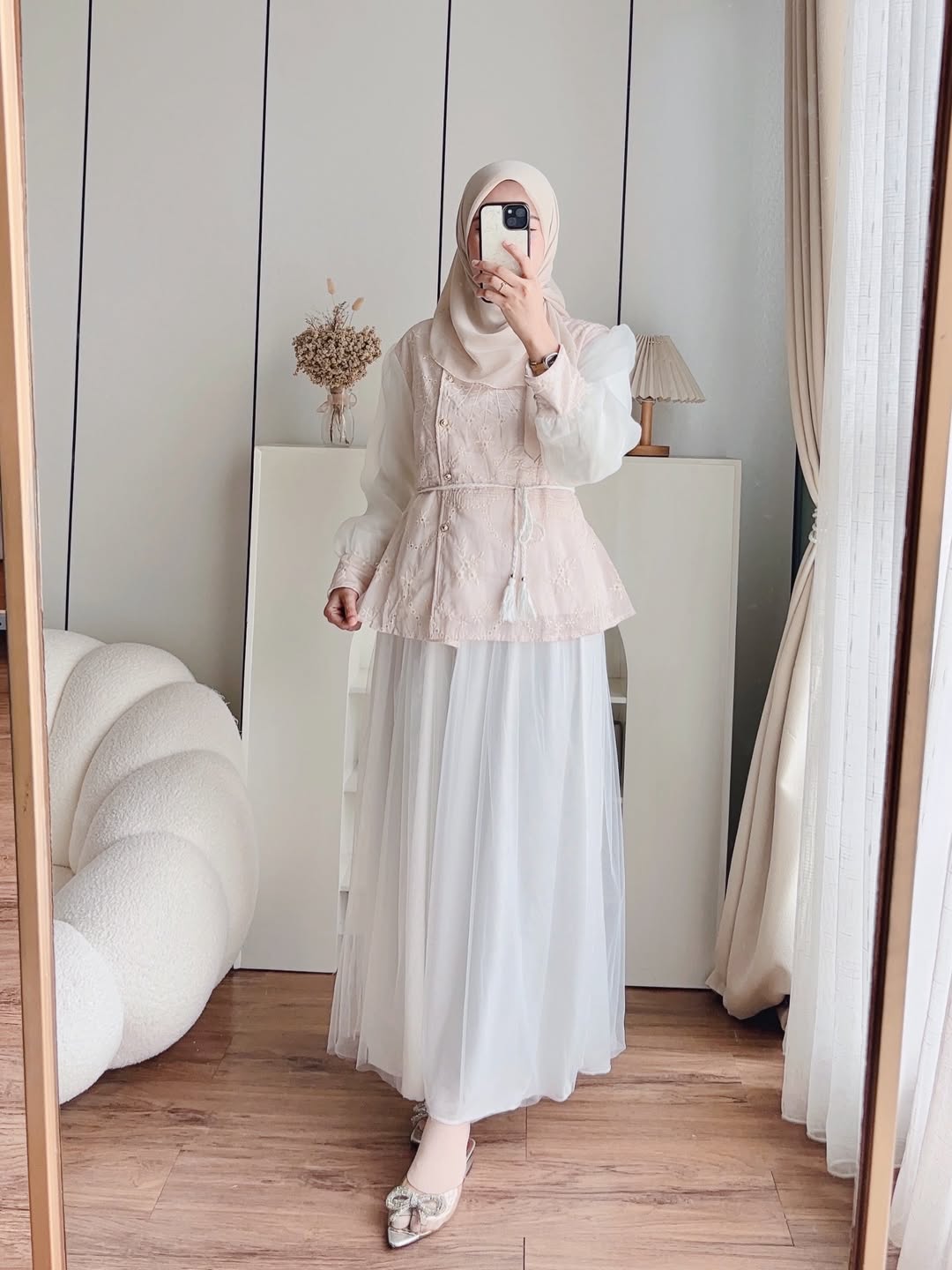 Bahan tencel silk kombinasi organza (atasan) dan bahan tile (rok), full furing