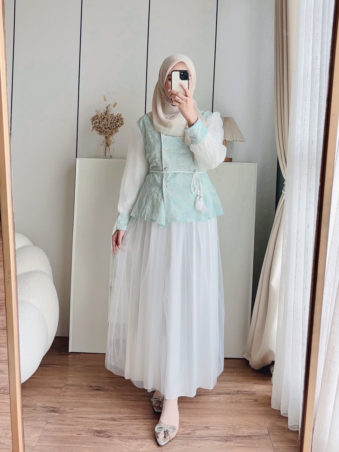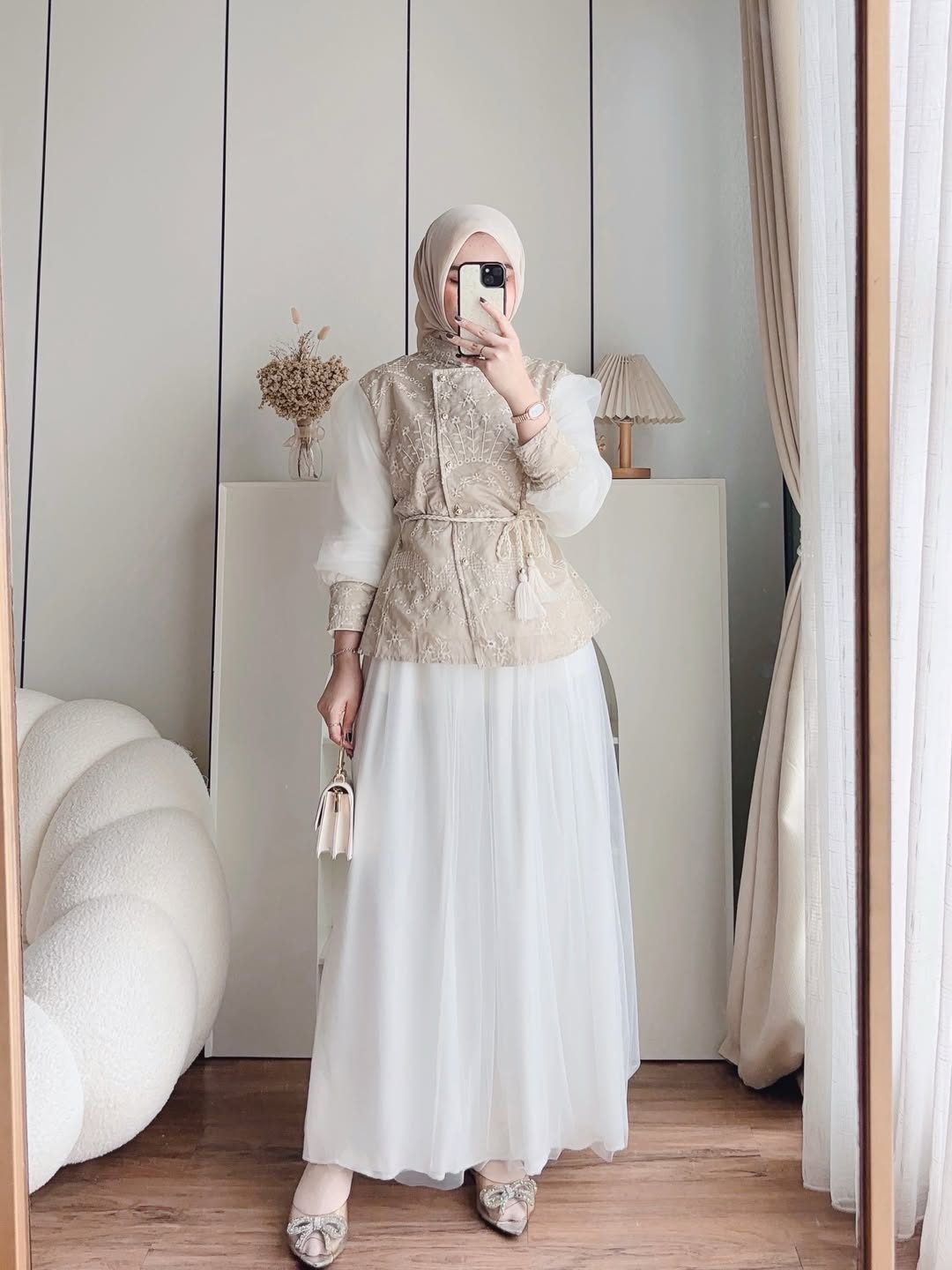 Bahan tencel silk kombinasi organza (atasan) dan bahan tile (rok), full furing