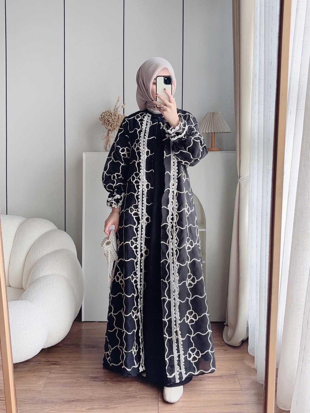 Bahan rib knit (inner) dan cotton organza (cardy). Outer bisa lepas pasang